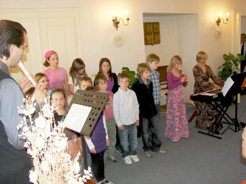 KONCERT PONĚKUD NETRADIČNÍ, ALE ZAJÍMAVÝ A MILÝ Byl k vidění a slyšení v podvečer 17. května v obřadní síni nižborského zámku. Vystoupili zde učitelé a žáci Soukromé základní umělecké školy Králův Dvůr s pestrým pásmem příjemných melodií, árií, známých písní, zpívaných a hraných na nejrůznější nástroje. Střídali se profesionálové – učitelé školy, a začátečníci i pokročilí - jejich žáci. Krásný dojem z jejich hudby a zpěvu byl ještě zvýšen zjištěním, že mezi nimi jsou i známé tváře zdejších dětí – představili se 2 flétnistky, 2 zpěvačky, malý pianista, malý flétnista a celý sbor zpěváčků z Nižbora a Stradonic spolu s učiteli hudební nauky v Nižboru manžely Hrachovcovými. Těšíme se, že je znovu uslyšíme, až v Nižboru i ve Stradonicích budeme společně vítat Vánoce pod rozsvíceným stromečkem.