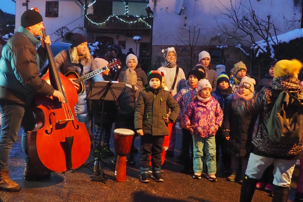 Slavnostní rozsvícení velikánského stromu by se dalo nazvat „slavností milého předvánočního setkání na návsi“. Nespočet vyznavačů této tradice zcela zaplnil rozlehlou a dobře nasvícenou stradonickou náves již od soumraku v sobotu 9. prosince. I přestože program je každým rokem podobný - přivítání návštěvníků paní starostkou nebo místostarostou, koleda zazpívaná muzikantem panem Klimentem a spojení kabelů zasloužilým po každé jiným stradonickým občanem. Na tuto chvilku rozsvícení se vždycky nejvíce těší děti, zvláště ty z Nižboru, které pak tradičně zpívají pásmo vánočních písní a koled. Letos i s hudebním doprovodem – kytarou, bubínkem, cinkátky a nově s basou. Kdyby se přidaly ještě děti, co hrají na flétny a klávesy, byl by z nich celý školní orchestr. Pak už všichni rádi přijali pozvání k bohatě prostřenému dlouhému stolu, kde bylo obětavými a šikovnými stradonickými hospodyňkami připraveno skoro vše, na co kdo dostal chuť. Na čaj, kávu, pivko, grog, horkou čokoládu, svařák, cukroví, koláče, dortíky, špekáčka, na grilovanou klobásu s hořčicí. Nezapomnělo se ani na charitu – výtěžek z prodeje maličkostí poputuje každoročně do domova opuštěných kočiček. I letos zastupovala obvyklý betlém hodné ovečky v ohrádce. To nebyla poslední příjemná nabídka hostům. Tou další, se zvědavostí očekávanou, je vždycky nástup půvabných žen a dívek sdružených pod jménem „Plamínek“ v čele s hercem-komikem Romanem Skamene, rovněž občanem Stradonic. Přivedl je ozdobené efektními parukami a dirigoval jejich efektní taneční kreaci, doprovázenou hudbou vážnou i moderní. Mohlo by se zdát, že to byl nejsilnější zážitek večera, pomyslná třešnička na dortu, ale byly toho večera ještě další, vyjádřené srdečným pozdravem a posvěcené objetím a políbením. Bylo jich mnoho, hřejivých navzdory nepříjemném mrazu. Zážitků z milého setkání téměř každého s každým, samozřejmě sousedů, ale i místních s hosty vzdálenými. Vyprávělo se, vzpomínalo se, chlubilo se. Bylo čím – čerstvými miminky v kočárku, hodným zase vyšším školáčkem, novinkami v rodině (i sousedově). A slibovalo se, že nejpozději za rok, tady na návsi ve Stradonicích, se určitě rádi spolu zase uvidí.