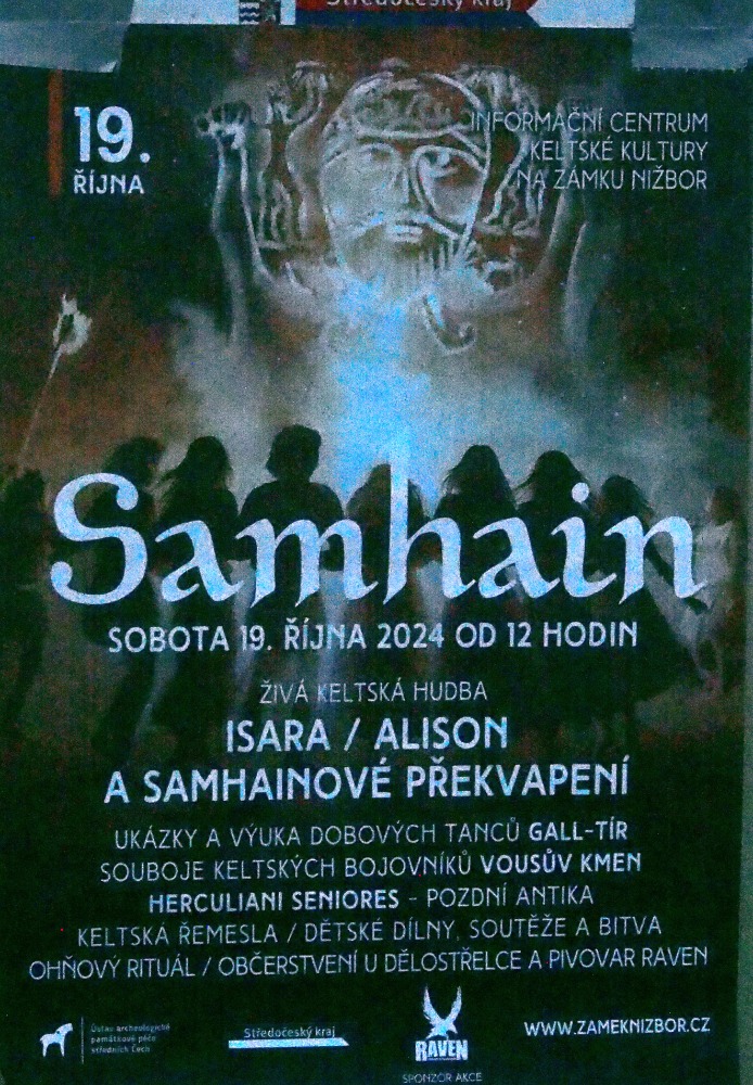 Sobotní odpoledne 19. října bylo pro vyznavače keltského svátku Samhain pravou lahůdkou. Všechno se povedlo jak mělo, i počasí tentokrát přálo, stánky s občerstvením a kavárnička k pohodě přispívaly ze všech sil, a program? Nebyl jak přes kopírák, přibylo vyprávění odborníků, například ředitelky ÚAPP SČ paní Mgr. Benkové na téma jak se loučívali staří Keltové s půlrokem hojnosti a nově o náplni práce středočeských archeologů. Kapely se obměnily a hrály pěkně divoce, ukázali se v plné kráse zase noví válečníci – Hercuilani Seniores - z trochu jiné doby (z konce římských výbojů) s odborným výkladem jejich ustrojení a zbroje. Irské tance předvádí skupina Gall-Tír pokaždé a pokaždé se líbí. Stejně jako válečníci Vousova kmene, kteří se v soubojích dokážou bít hlava nehlava, až jiskry létají a nezranit se. Zas se mnoho párů s nadšením učilo základům irských tanců naživo. Na okrajích nádvoří bylo opět něco nového, hezkého a zajímavého k vidění a hlavně k poučení. Kromě už tradičních ukázek mnoha keltských řemesel plno návštěvníků poprvé vidělo, jak se kdysi sléval v žáru výhně bronz z kousků mědi a cínu. Ten nakonec žhoucí opravdu zaplnil malou formičku. Odborný výklad pokračoval výčtem a ukázkami, co všechno šikovní Keltové dovedli z bronzu odléváním do forem vyrobit. Samozřejmě byla otevřena (letos naposled) obsáhlá a poučná expozice uvnitř zámku, co nejnázorněji zobrazující svět starověkých Keltů.