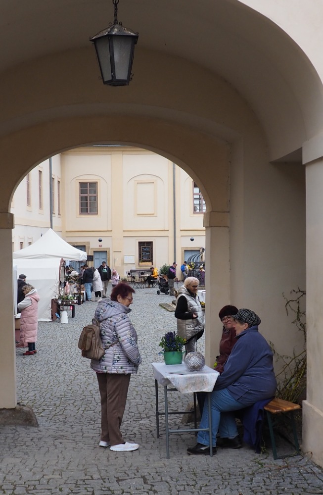 Zas se nižborským zahrádkářům něco povedlo! Co? Založit tradici – Velikonoční jarmark na zámku. Přestože chvílemi pořádně fučelo, tolik návštěvníků jako tuto jarní sobotu přichází a přijíždí na zámek jen málokdy: tradičně oslavit keltské svátky Beltain a Samhain, podívat se na Duellanty a nejvíc pak na dvoudenní podzimní zahrádkářskou výstavu. K těmto silným magnetům nyní přibyl další - Velikonoční jarmark připravený šikovnými a obětavými členy Zahrádkářského svazu Nižbor. Na výzdobě nádvoří se podíleli dokonce i předškoláčci z místní Mateřské školky Sluníčko. V loňském jarmarku kolem dvaceti, letos přes čtyřicet vystavovatelů bylo sezváno, aby ukázali a nabídli zvědavým návštěvníkům své výrobky oslavující příchod jara. Víc vystavovatelů přineslo do stánků o poznání pestřejší výběr lákadel. Samozřejmě plno drobností pro malé parádnice, pro větší hezké nekonfekční přírůstky do šatníku. K mání byly letos nejen klasické pomlázky, košíčky, kytičky, zajíčci a kuřátka, ale i kraslice vyrobené nevídanými náročnými technikami, zvláštní srdíčka, odvážné tvary šperků z kovu a sklíček, figurky hezky ušité, jiné vypálené z hlíny nebo vyřezané ze špalíčku. Udivující byla šikovnost a trpělivost tvůrkyně hezkých obrázků, čárku po čárce vypalovaných elektrickou jehlou do povrchu dřevěné destičky a stejně tak tvůrkyně náramků, spletených z desítek barevných pramínků, vzniklých navlečením až patnácti set titěrných korálků na tenounké drátky.