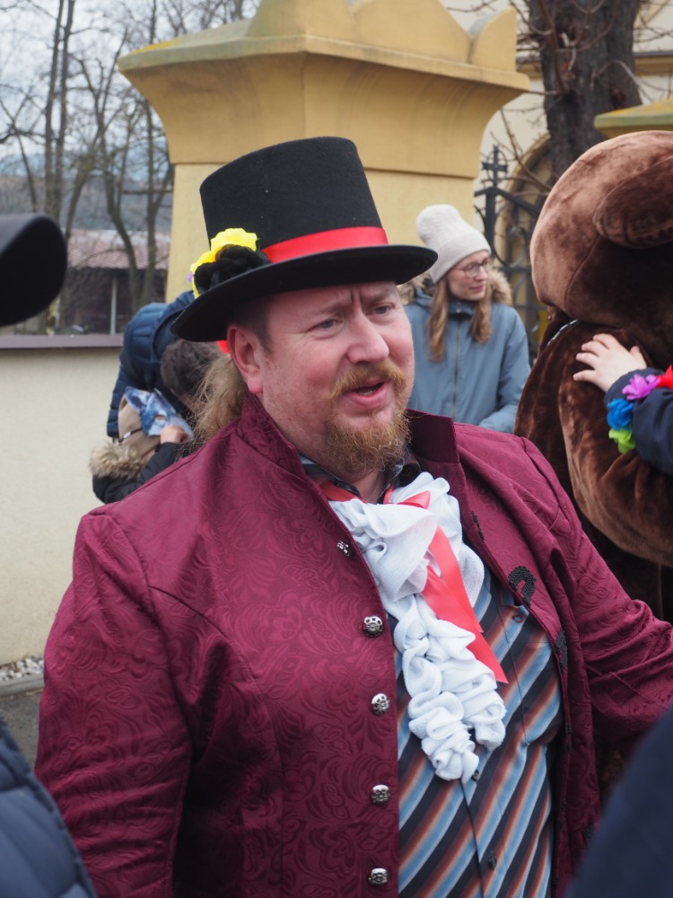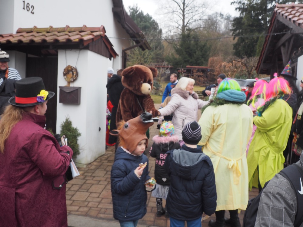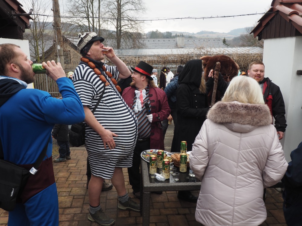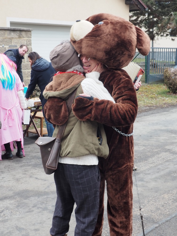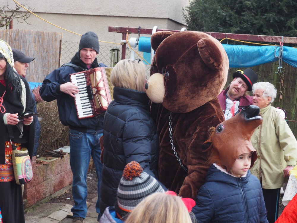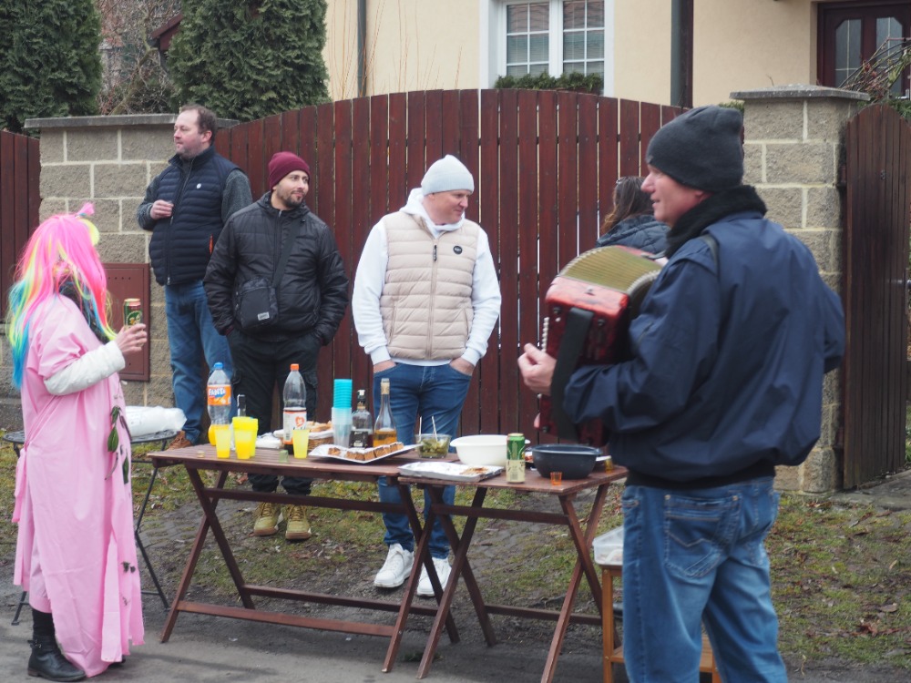 Počasí sice nebylo ještě úplně jarní, ale ranní chlad neodradil desítky natěšených stradonických občanů od společného tradičního tažení od domu k domu s muzikou, v pestrých maskách a s dobrou náladou. Masopustní průvod vedený principálem Janem Doležalem a panem Mašićem v masce mohutného medvěda se zastavoval tam, kde tuto tradici stále ctí a vítají houf svých sousedů před vraty i za vraty nabídkou pestrého pohoštění z vlastní kuchyně a otevřenými lahvinkami. A tak se zvesela hodovalo, popíjelo, povídalo, zpívalo a tancovalo celé dopoledne. Harmonikář pan Bukáček byl nepostradatelný v průvodu i na každém dvorku, kde se paní domu odvážila vnořit do chlupaté medvědí náruče v krátkém tanečku. I stradonické děti se zapojily, kromě robátek v kočárku poletovaly sem tam v hezkých maskách a musely být u každého tradičního ceremoniálu inkasa od řidičů za povolení průjezdu. Následující momentky jen z několika z mnohých sobě podobných zastavení věrně ilustrují, že ve Stradonicích se umějí společně rozveselit, notabene když je k tomu známá tradice přímo svádí.