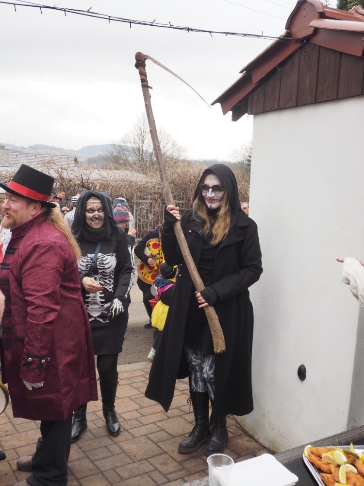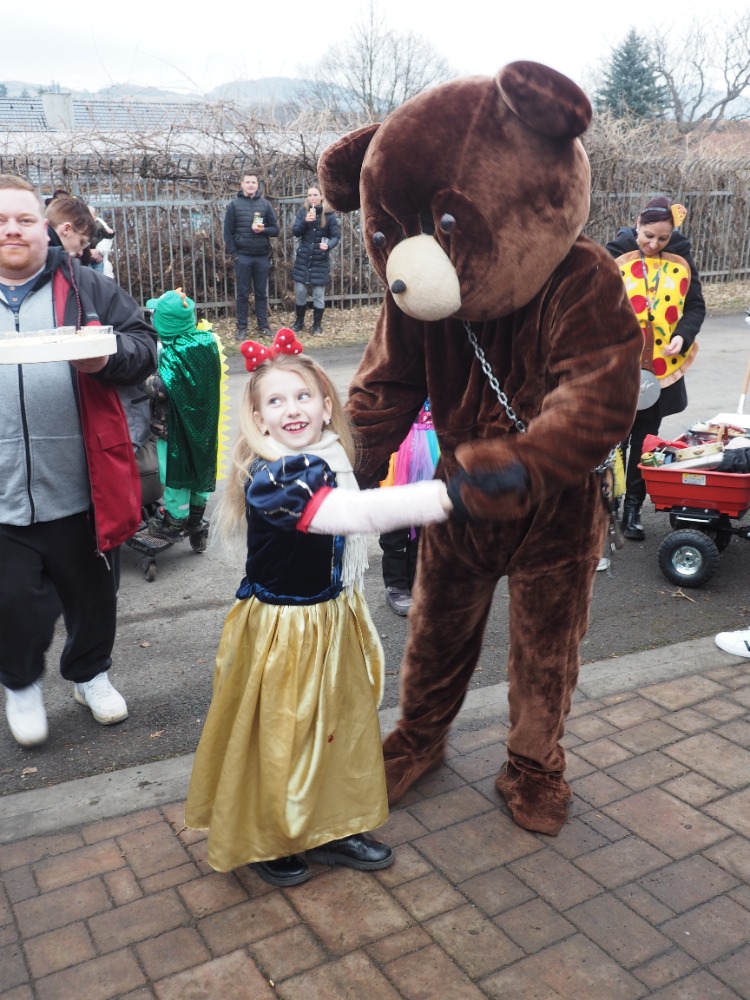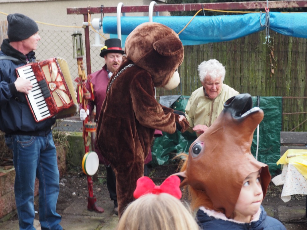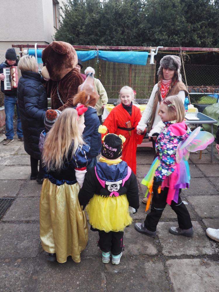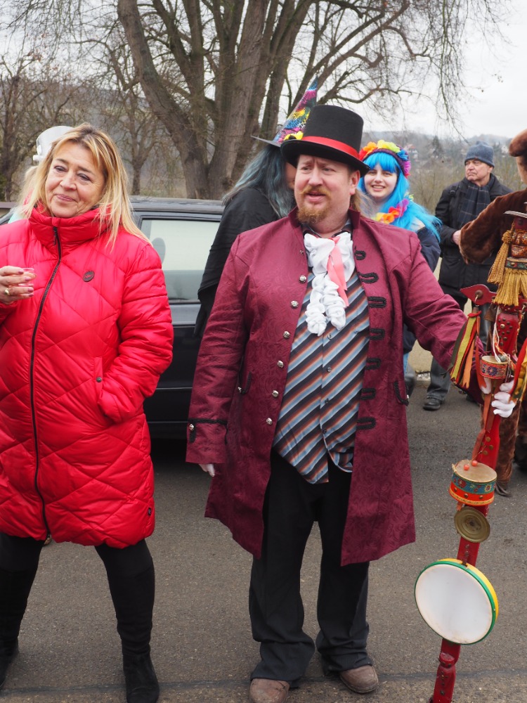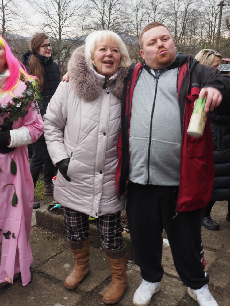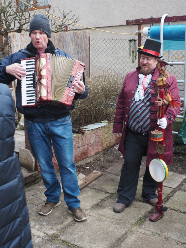 Počasí sice nebylo ještě úplně jarní, ale ranní chlad neodradil desítky natěšených stradonických občanů od společného tradičního tažení od domu k domu s muzikou, v pestrých maskách a s dobrou náladou. Masopustní průvod vedený principálem Janem Doležalem a panem Mašićem v masce mohutného medvěda se zastavoval tam, kde tuto tradici stále ctí a vítají houf svých sousedů před vraty i za vraty nabídkou pestrého pohoštění z vlastní kuchyně a otevřenými lahvinkami. A tak se zvesela hodovalo, popíjelo, povídalo, zpívalo a tancovalo celé dopoledne. Harmonikář pan Bukáček byl nepostradatelný v průvodu i na každém dvorku, kde se paní domu odvážila vnořit do chlupaté medvědí náruče v krátkém tanečku. I stradonické děti se zapojily, kromě robátek v kočárku poletovaly sem tam v hezkých maskách a musely být u každého tradičního ceremoniálu inkasa od řidičů za povolení průjezdu. Následující momentky jen z několika z mnohých sobě podobných zastavení věrně ilustrují, že ve Stradonicích se umějí společně rozveselit, notabene když je k tomu známá tradice přímo svádí.